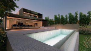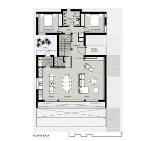 La planta principal, de 142,80m2, cuenta con otros dos dormitorios, un aseo y un baño completo. También hay una espaciosa cocina americana, lavadero, acceso al patio interior y un amplio y elegante salón-comedor con acceso directo a la terraza exterior, donde podrá disfrutar del sol de la tarde en la zona de relax, junto a la piscina infinita de 27 m de largo.
