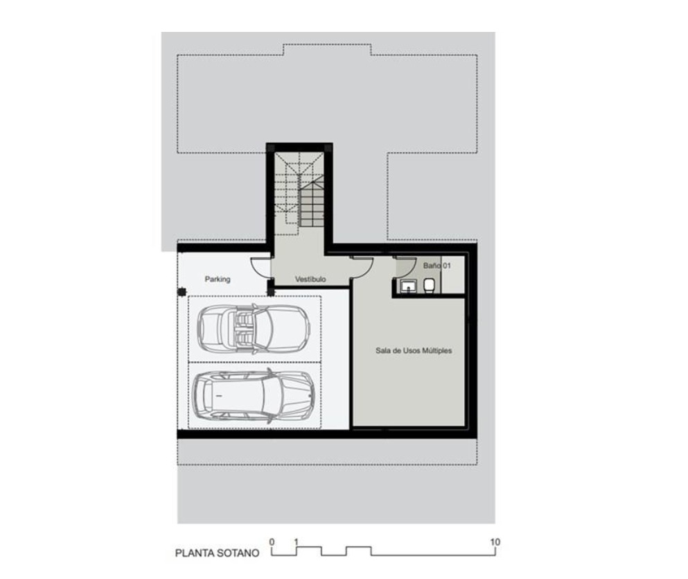El sótano de 92,55 m2 incluye un cuarto de baño, una sala polivalente y una habitación de 34,80 m2, que puede adaptarse a sus necesidades. También da acceso a un garaje para dos vehículos.
